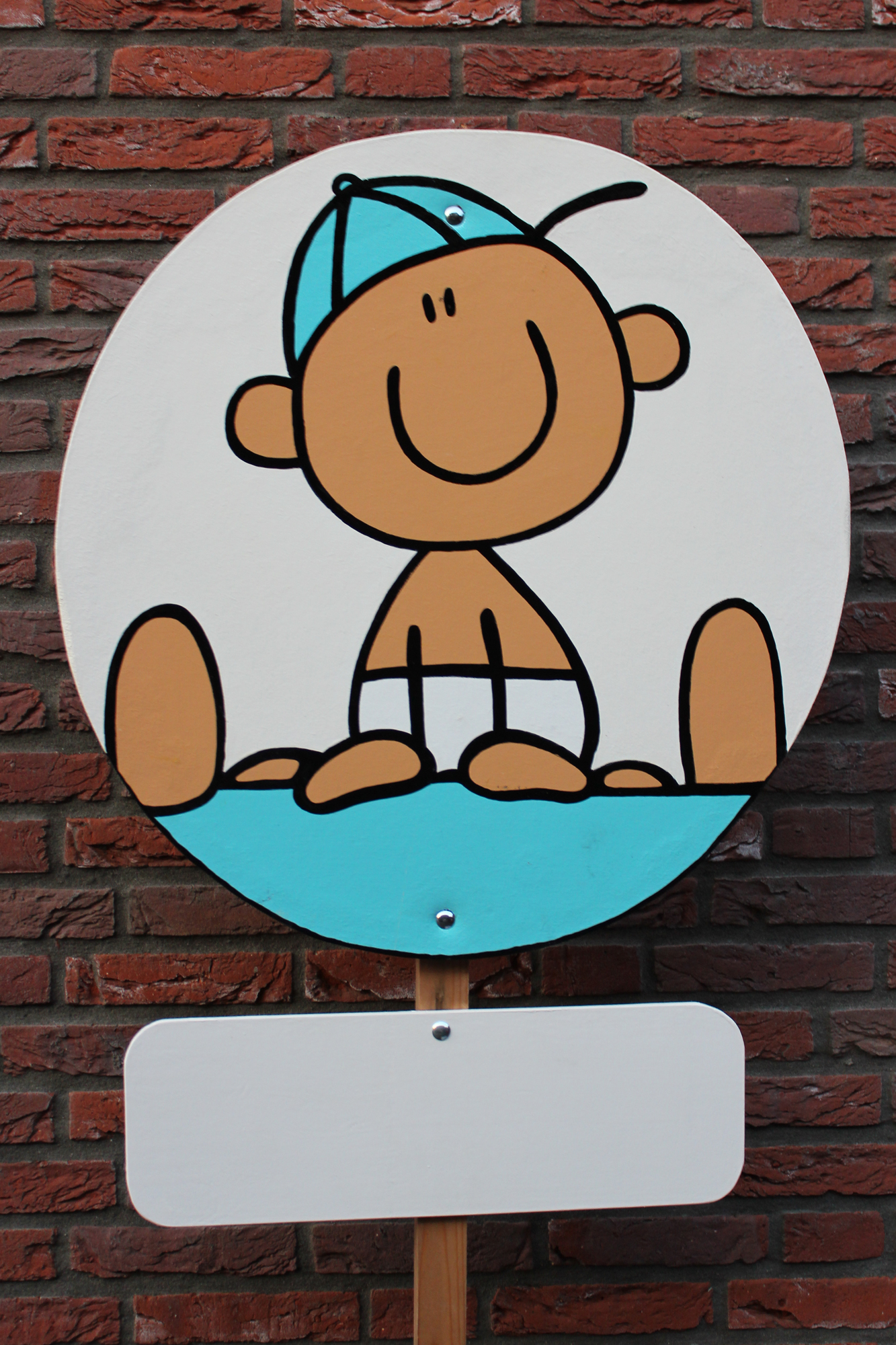 Dit geboortebord van een blije baby met pet is een vrolijke noot voor de tuin. Het is een rond compact bord met een afzonderlijk naambordje. Dit bord is uitermate geschikt voor de geboorte van een jongen.
