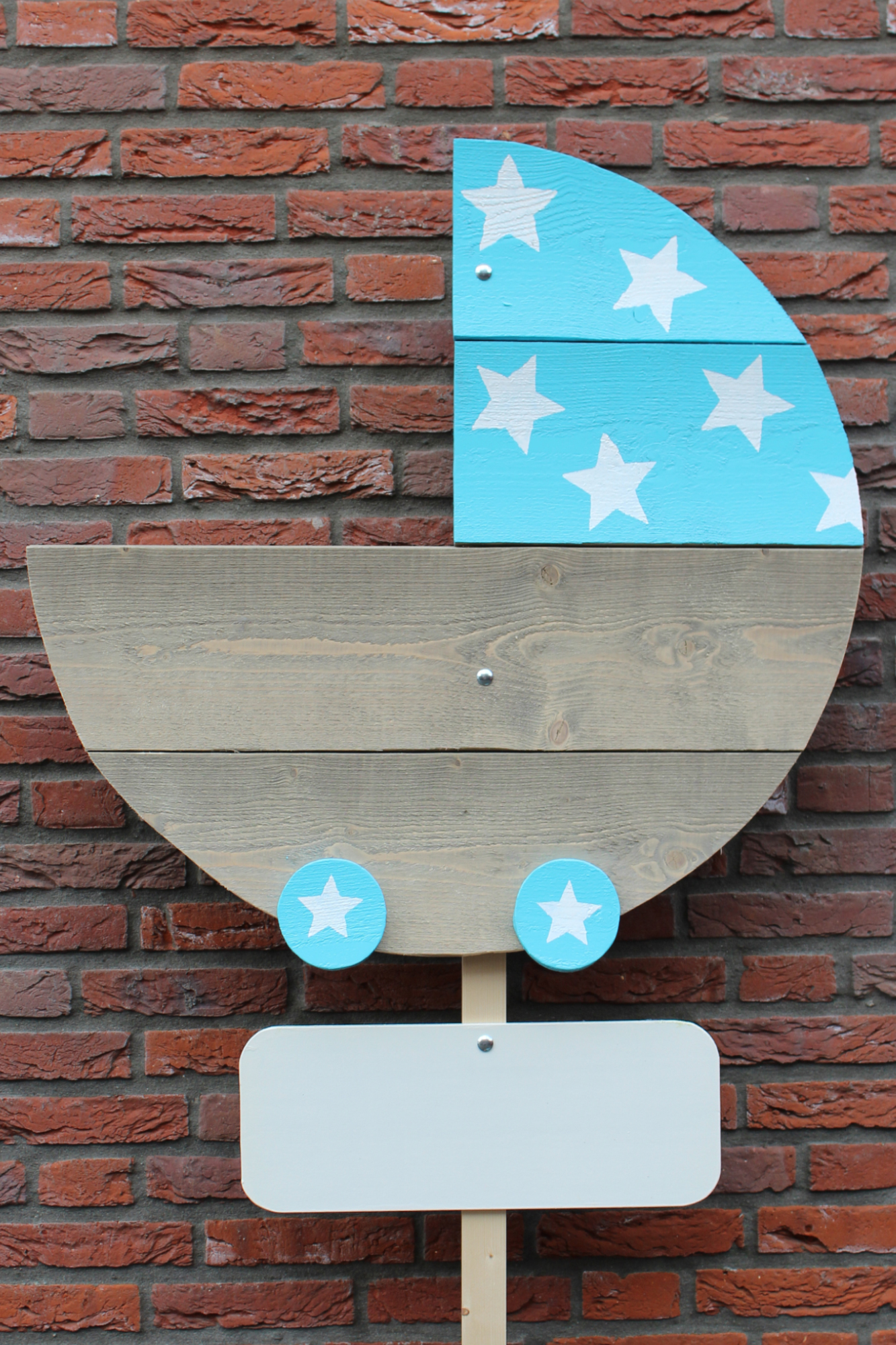 Deze vrolijke kinderwagen is helemaal van nu. Dit stoere maar toch schattige geboortebord is gemaakt van steigerhout en is zeer geschikt voor een jongen.