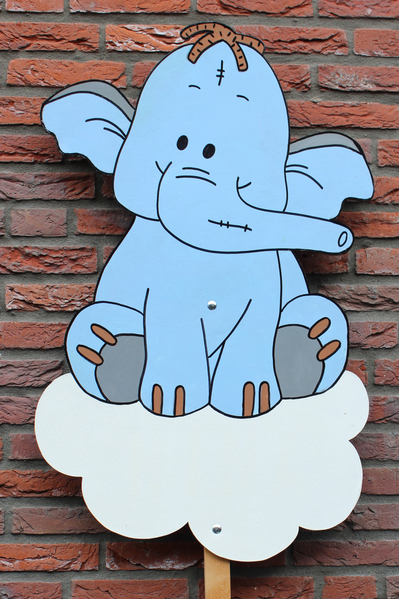 Deze olifant, beter bekent als lolifantje, zit op een “witte” wolk. Dit vriendje van Poeh beer / Pooh bear is een schattige aankondiging van de geboorte van een kindje. De naam kan in de wolk vermeld worden. Geboortebord Lolifant is zowel geschikt voor een jongen als voor een meisje.